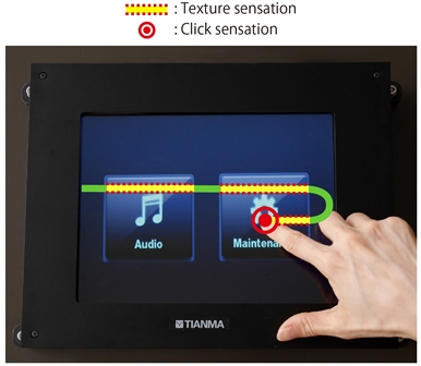 With this prototype, when users trace an image (button in the photo example) shown on the display, their fingers will sense a rough “texture” feeling, and when users press an image area, they will sense a “click feeling” as if they are pressing a mechanical button. This will allow users to perform a series of operations such as locating and pressing an on-screen button, and then determining an operation without needing to look directly at the display.