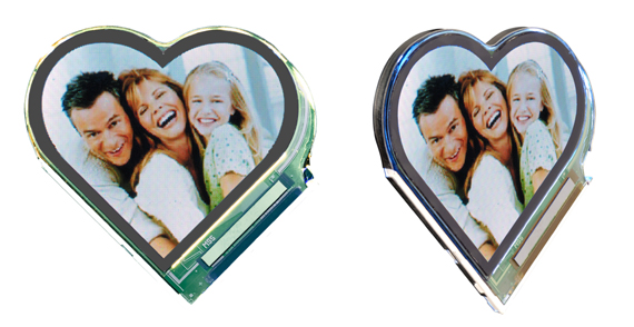 試作機は、2つの円弧と2つの直線によって構成される「ハート型」形状の低温ポリシリコンTFTカラー液晶ディスプレイモジュールで、画面表示部は幅4.0cm、高さ3.6cm、画素ピッチは174ミクロン(146ピクセル/インチ)です。